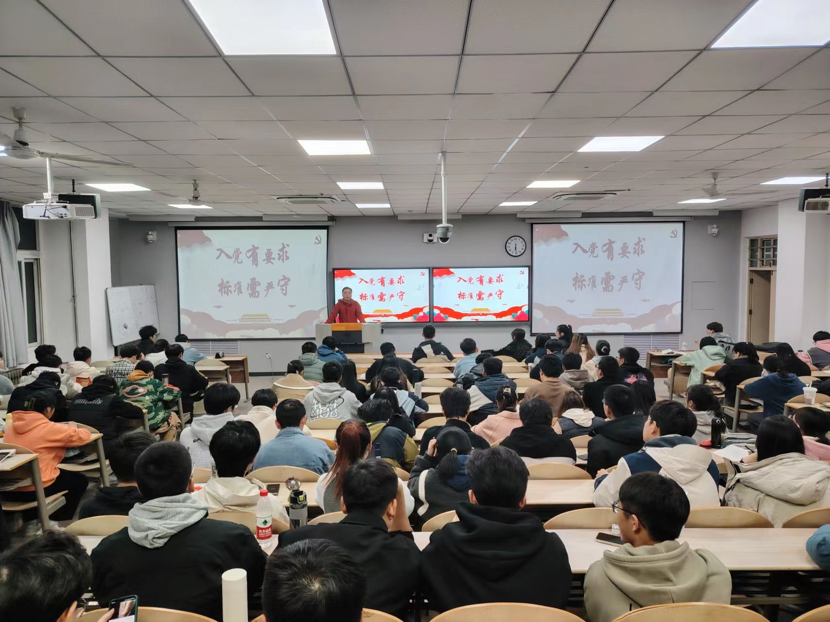 11月16日晚,我院第67期入党积极分子培训班第六讲“入党有要求,标准需严守”于教2-212开讲,建工学院组织员董元浩老师为150余名党课学员进行授课。