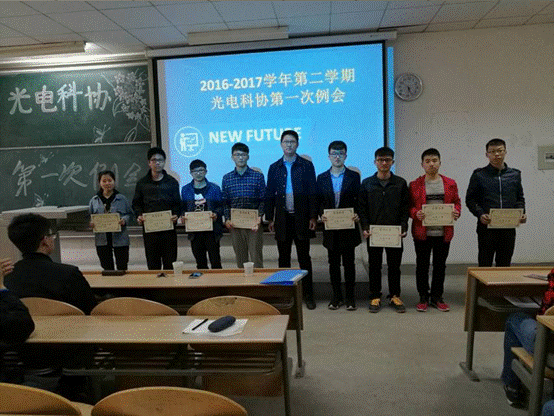 随后,对上学期表现优秀的16级8名科协干事进行了表彰,他们是高重阳、龚卓、叶文韬、、周子杰、孙瑞清、赖雄、雷嘉兴,李老师给他们颁发了荣誉证书。优秀干事代表李雨晴上台发表获奖感言:感谢学院提供给她们这样一个良好的学习锻炼自己的平台,在科协锻炼了自身的能力也认识了许多志同道合的朋友,培养了她们学习、工作、思维的能力,表示在以后的学习工作中一定再接再厉,再获佳绩。