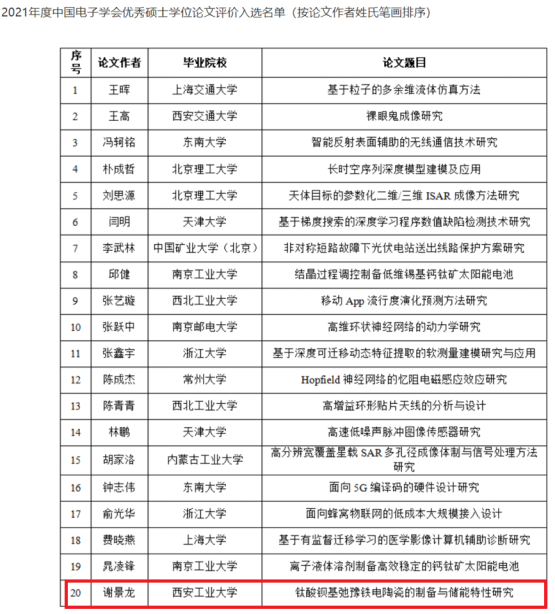 近日,中国电子学会公布了2021年度优秀硕士学位论文评选结果。mile米乐体育2020届硕士研究生谢景龙(现南京大学博士)的硕士论文《钛酸钡基弛豫铁电陶瓷的制备与储能特性研究》,入选中国电子学会2021年度优秀硕士学位论文,指导教师为戴中华教授。这是西安工业大学首次获此殊荣。
