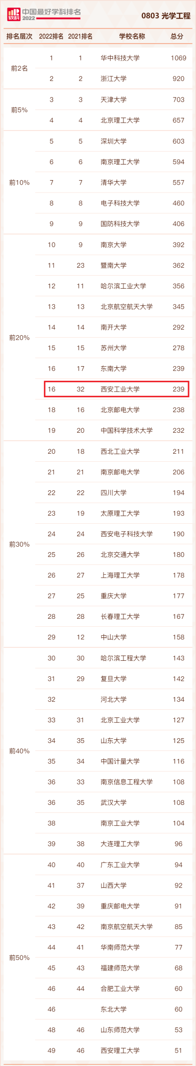 2022年9月21日,高等教育评价专业机构软科今日正式发布“2022软科中国最好学科排名”。光学工程学科共有49所大学上榜。西安工业大学的“光学工程”学科,位居全国第16位,学科排名前20%。