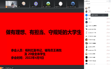 4月9日下午,光电工程学院在线上召开主题为“做有理想,有担当,守规矩的大学生”的年级会议,会议由学院2020级辅导员王尧悦主持,学院党委副书记杨利红以及2020级全体本科生参加了会议。