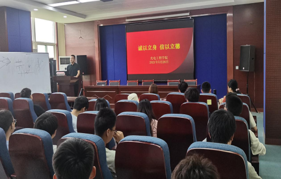 本次活动主题为“诚以立身 信以立德”,活动由诚信观影、书写诚信寄语及诚信宣誓组成。雷浩然老师首先向在场学生详细解读了生源地信用助学贷款的相关事宜,并号召学生诚信从我做起。接着,大家共同观看了微电影《助学铸诚筑梦》,通过观影同学们加深了对诚信的理解,并写下了诚信寄语。最后,在2018级学生冯晨虹的带领下,同学们进行了庄严宣誓,展现了光电学院学子积极向上的精神风貌,传递了诚信正能量。