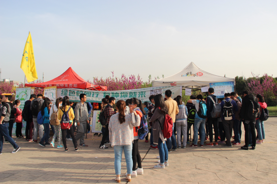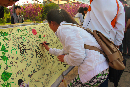 “绿植领养”活动分为二个阶段,第一阶段从4月20日开始通过微博、微信宣传号召大家爱护环境从身边做起,把绿色带回宿舍。第一阶段全校有多1300人参加,第二阶段现场活动,同学们通过扫二维码便可领取花盆和花种,花种主要有波斯菊、太阳花、雏菊、夏香等,领取成功的同学还可以领取精美小礼物一份,并在环保宣传墙板上签名,倡导环保意识。现场活动当天细雨蒙蒙,但同学们参加活动的积极性依然很高,本次活动共计发放花种3500颗,花盆1800个。