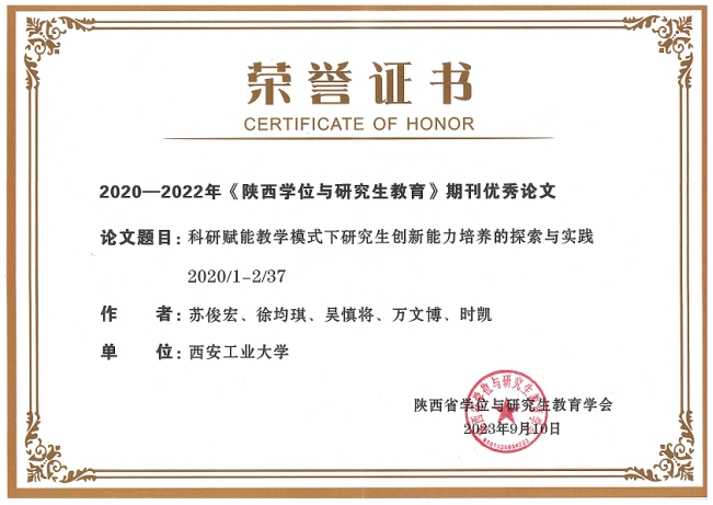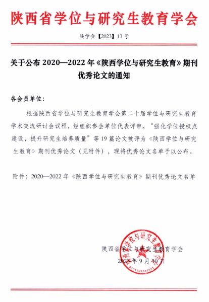据陕西省学位与研究生教育学会文件通知(陕学会[2023]13号),由我校mile米乐体育苏俊宏教授等人撰写的《科研赋能教学模式下研究生创新能力培养的探索与实践》一文,被评为2020-2022年《陕西学位与研究生教育》期刊优秀论文,颁发了优秀论文证书。据悉,此次评选的优秀论文,是从学会近三年(2020-2022年度)每年一次的学术年会投稿论文中评选产生的,也是我校首次获得这一殊荣。