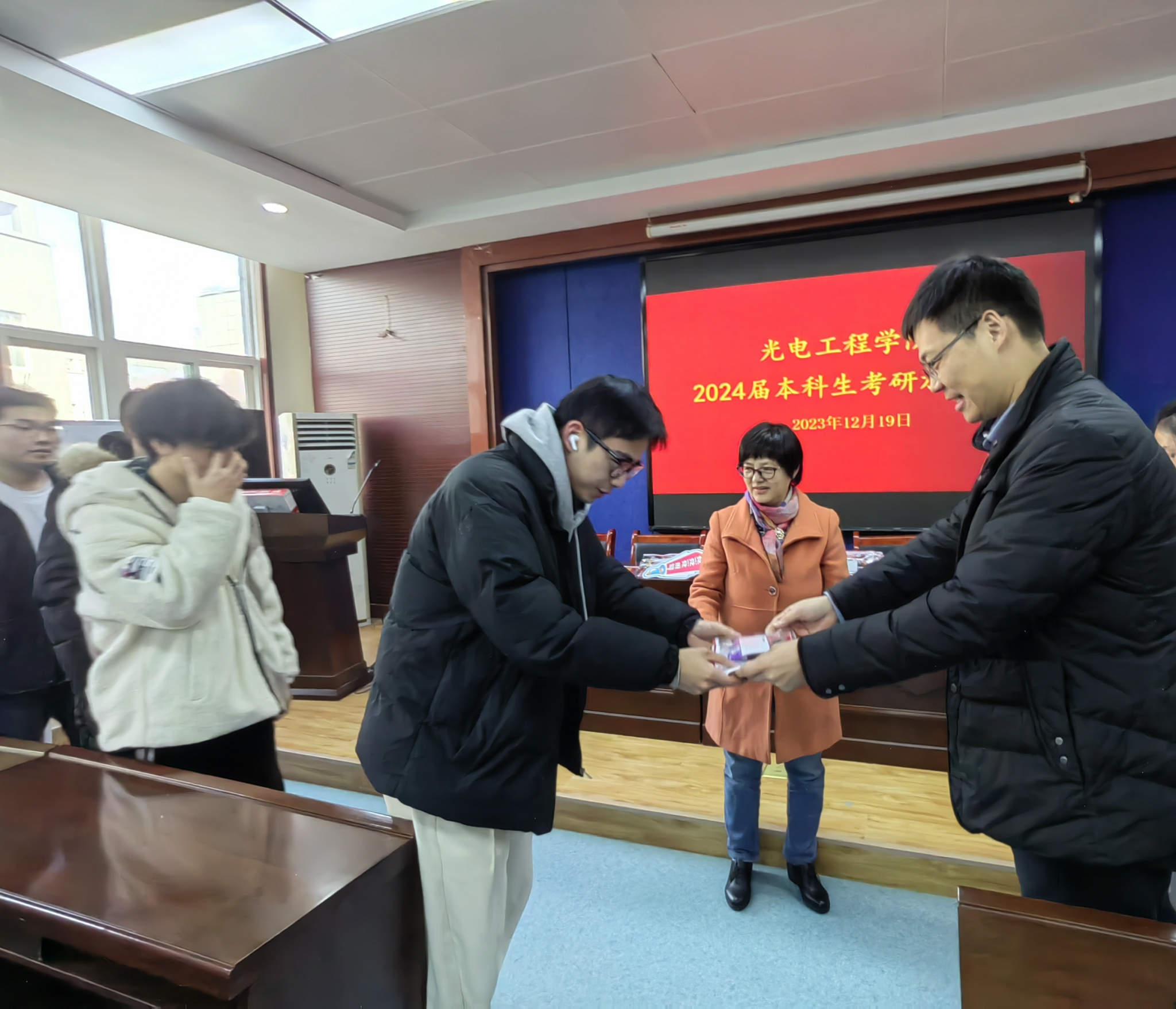 首先,杨利红以自身当年考研经历,激励同学们一定要相信自己,一定要坚持考完每门课程;要调整好心态,轻松应考,考出最好水平。周顺结合我院的优良考研传统,以及今年的报考人数为同学们加油打气。他充分肯定了考研学子一路走来的坚定意志和辛苦努力,高度赞扬了同学们的备考状态。鼓励同学们一鼓作气,以最佳状态奔赴考场。同时也叮嘱同学们注意身体健康,并预祝同学们成功上岸,一研为定。最后为考研学子发放学院精心准备的暖心礼品,有“孔庙祈福文具套装”、糖果以及防疫物资,表达对考研学子的关心与美好祝愿。