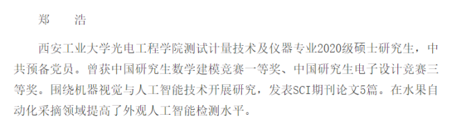 郑浩,西安工业大学mile米乐体育测试计量技术及仪器专业2020级硕士研究生,中共预备党员,2022年硕士研究生国家奖学金获得者。
